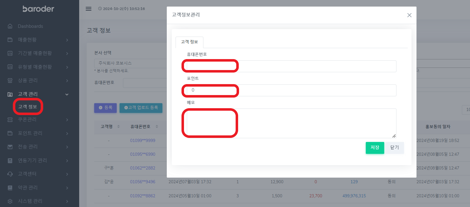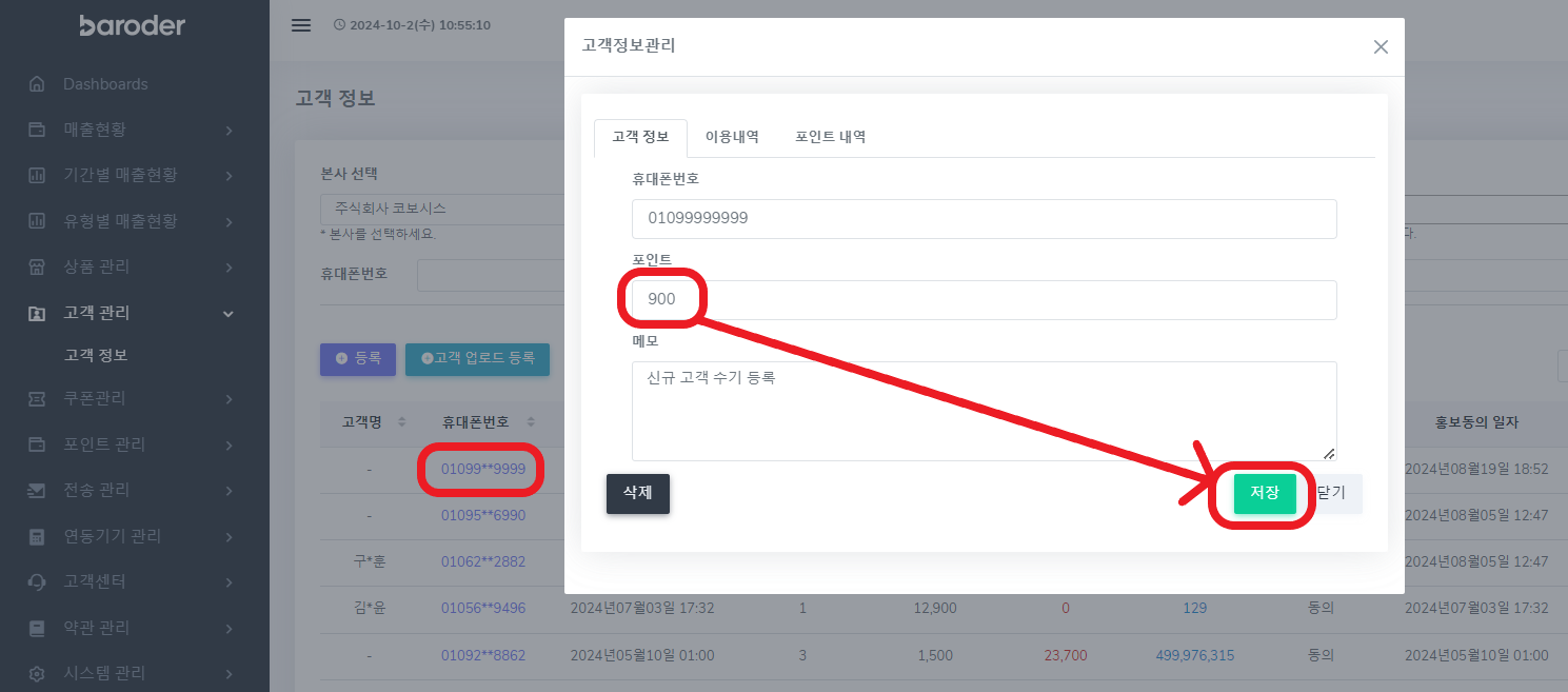 휴대폰번호, 보유 포인트, 메모 입력 후 저장버튼 클릭 시 고객 등록됩니다.
