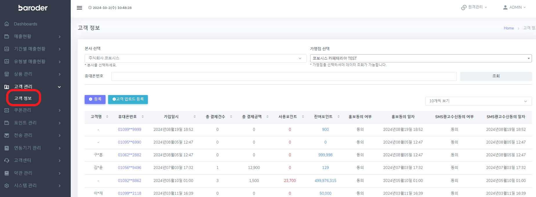고객 휴대폰번호, 결제 건 수, 결제 금액, 포인트, 스탬프 등 정보를 조회할 수 있습니다.