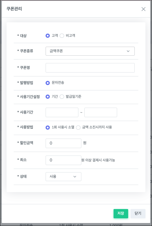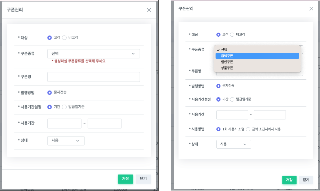 2. 쿠폰관리 팝업 내 쿠폰종류 > 금액쿠폰으로 선택