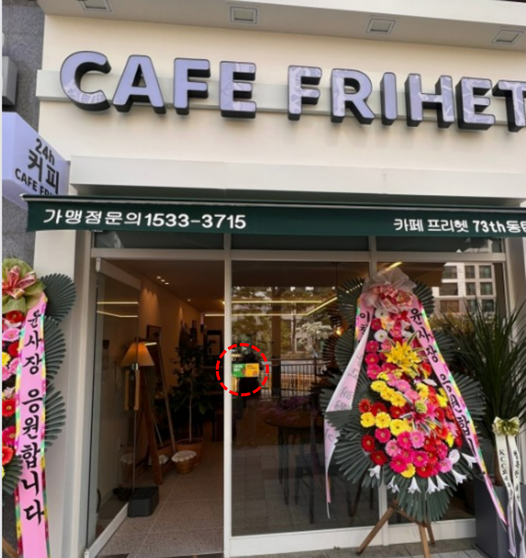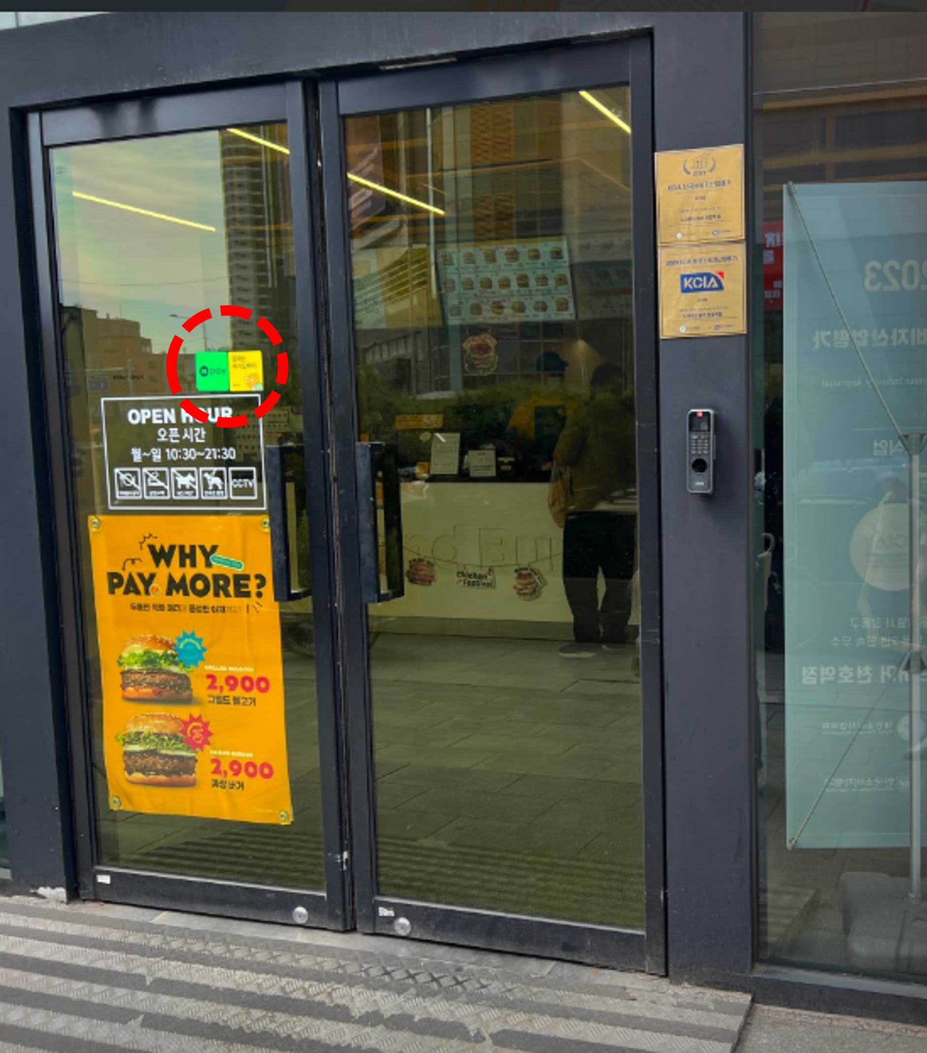 - 2번 스티커(매장입구스티커)는 부착되지 않아도 됩니다. 매장 입구사진