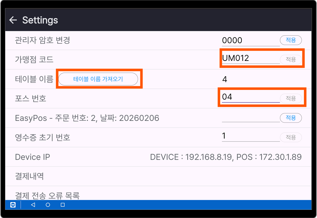 포스 번호 : 포스번호는 테이블 번호화 동일하게 설정