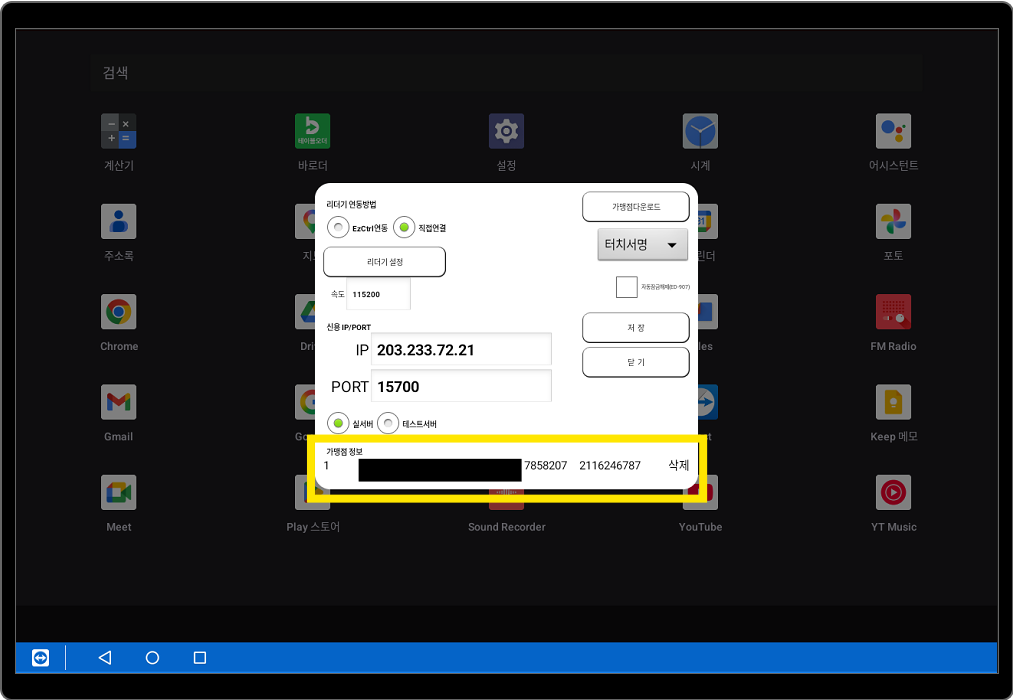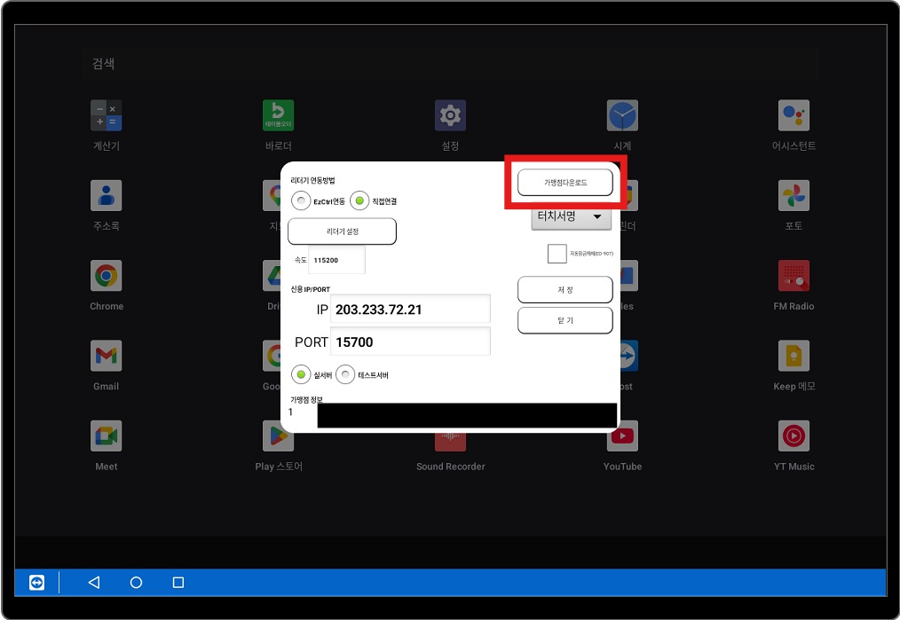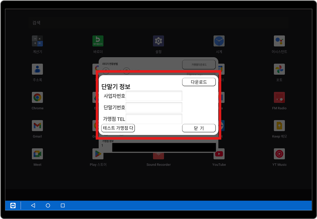 사업자번호 / 단말기번호 / 전화번호 입력후 다운로드 선택하면 가맹점 설정 완료