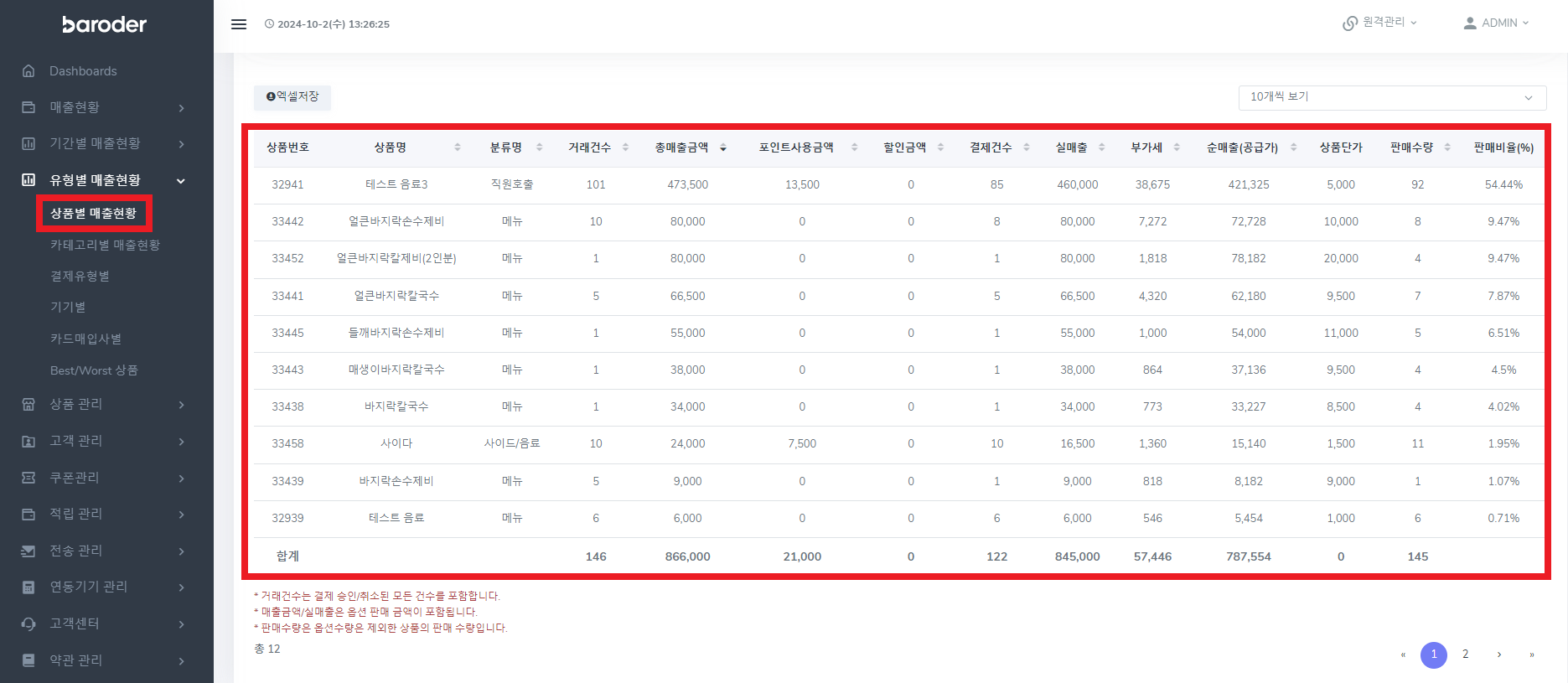 상품별 매출현황 확인 가능합니다.