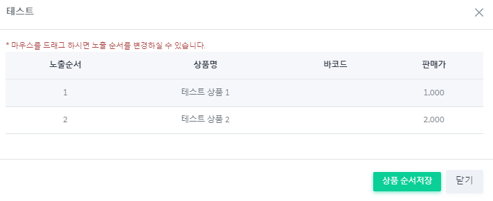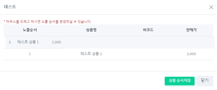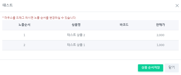 [마우스로 테스트 상품1을 드래그 하여 위로 올림 작업]