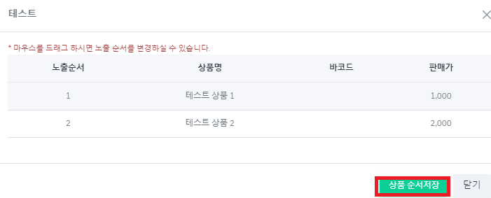 5. 변경 정보 확인 후 상품 순서 저장 버튼을 클릭 합니다.