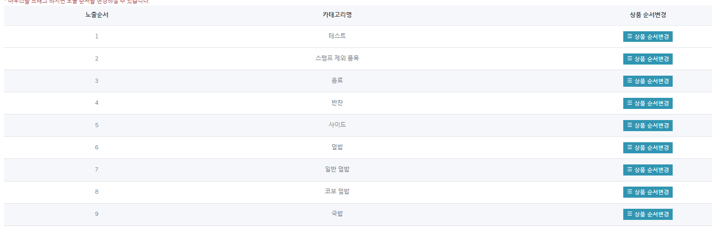 7. 카테고리 노출 순서 변경도 같은 방법으로 마우스로 클릭 후 드래그 하여 위치를 수정 하실 수 있습니다.