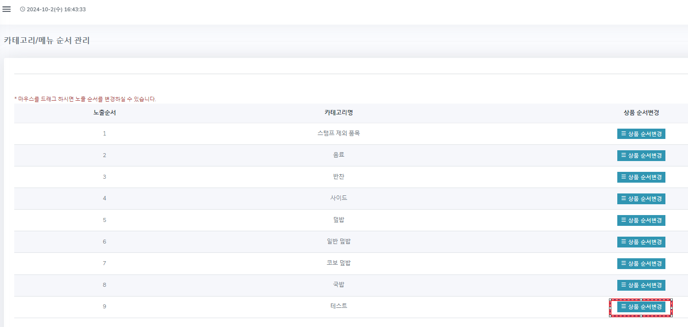 2. "카테고리/메뉴 순서 관리" 버튼 클릭 합니다.