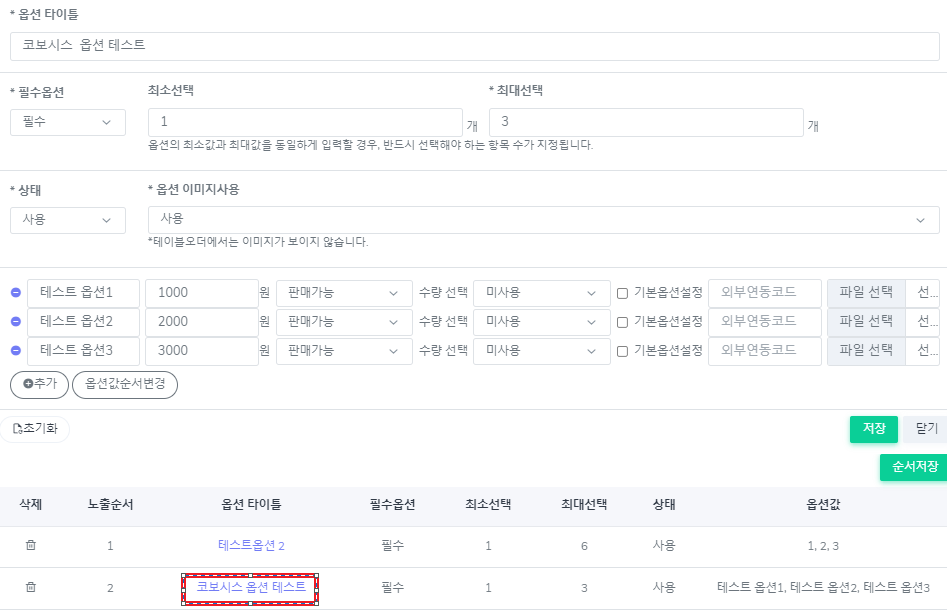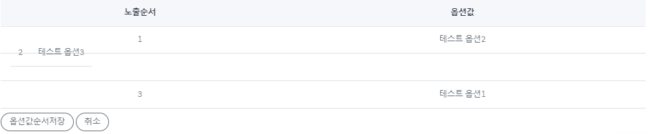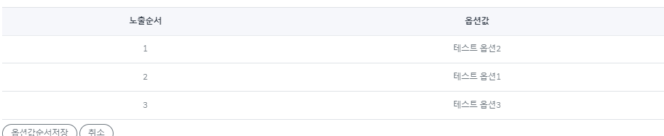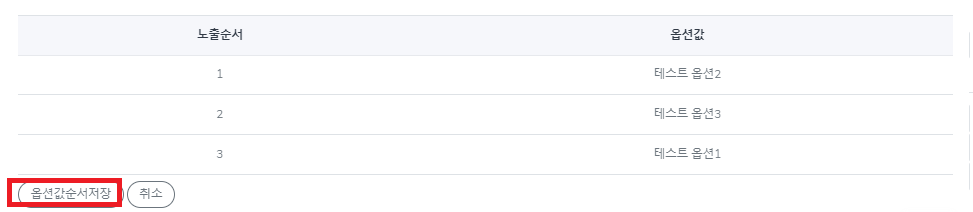 8. 변경 된 옵션 순서 값을 확인 후 "옵션값순서저장" 버튼을 클릭 합니다.