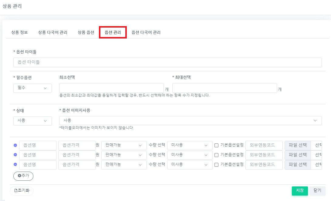 4. 팝업 된 "상품 관리" 화면에서 "옵션 관리" 를 클릭 합니다.