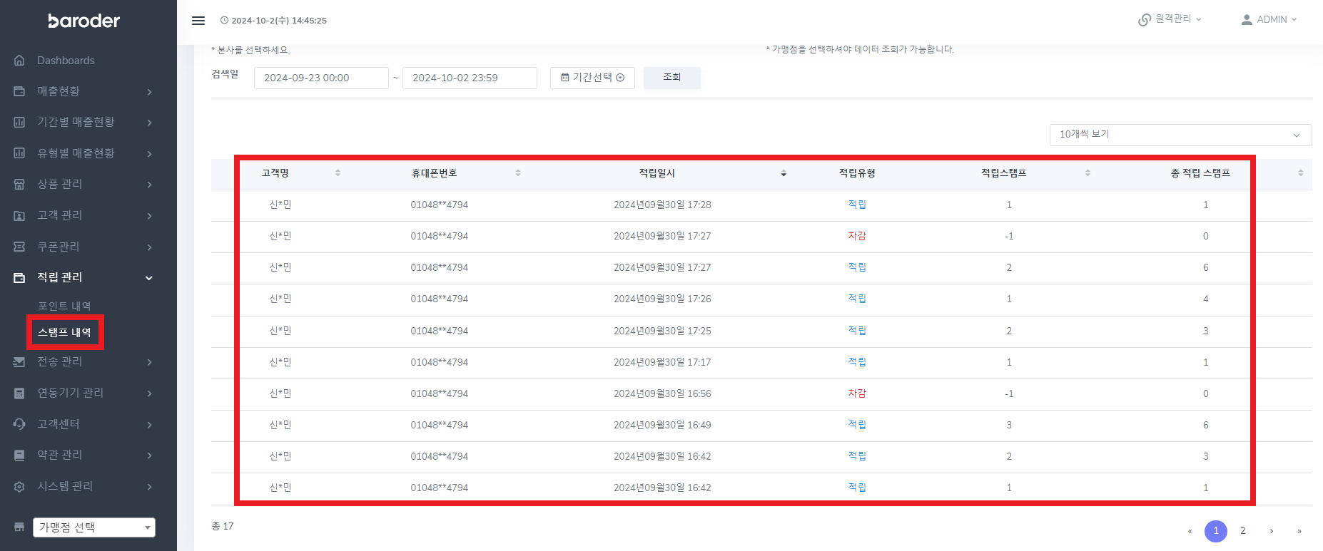 매장에서 스탬프 적립된 내역을 확인할 수 있습니다.