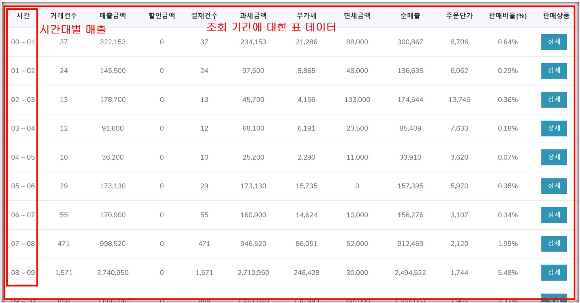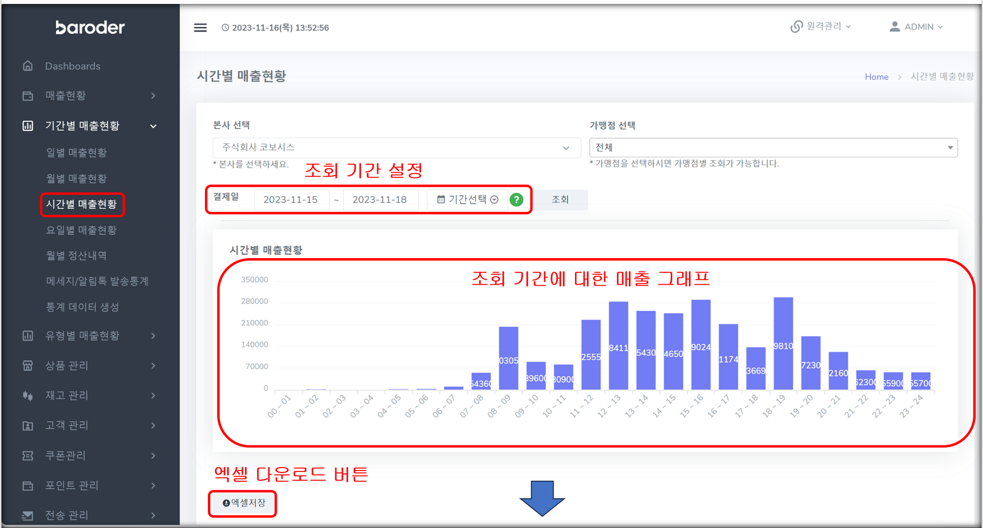 조회 기간을 설정하여 해당 기간에 대한 시간대별 매출 조회 메뉴
