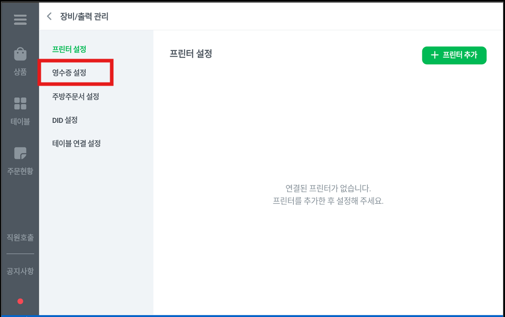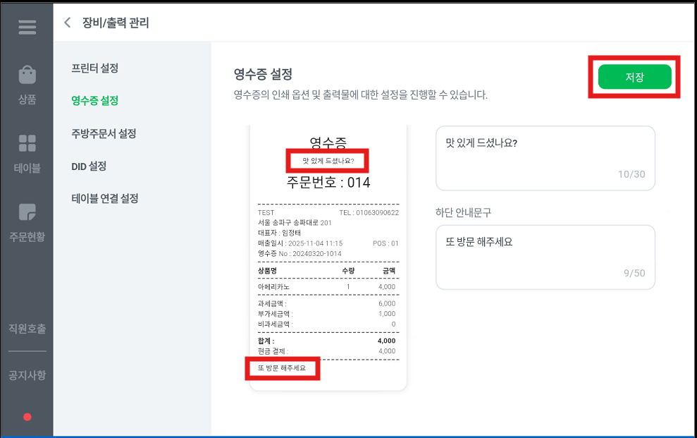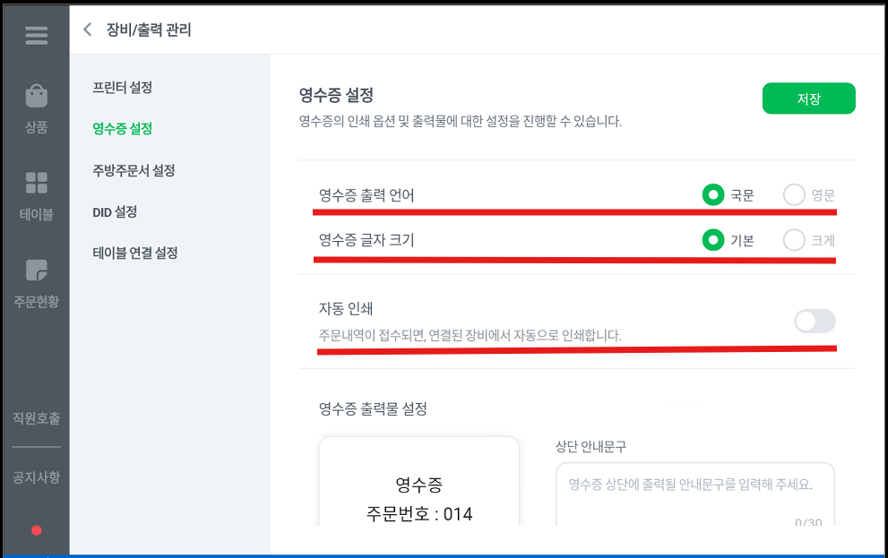 영수증의 인쇄 옵션 및 출력물에 대한 설정영수증 출력 언어영수증 글자 크기자동 인쇄 여부영수증 출력물 설정영수증 설정 진입 좌측 상단 메뉴바 클릭장비/출력 관리 클릭영수증 설정 클릭설정 완료 후 저장 버튼 클릭