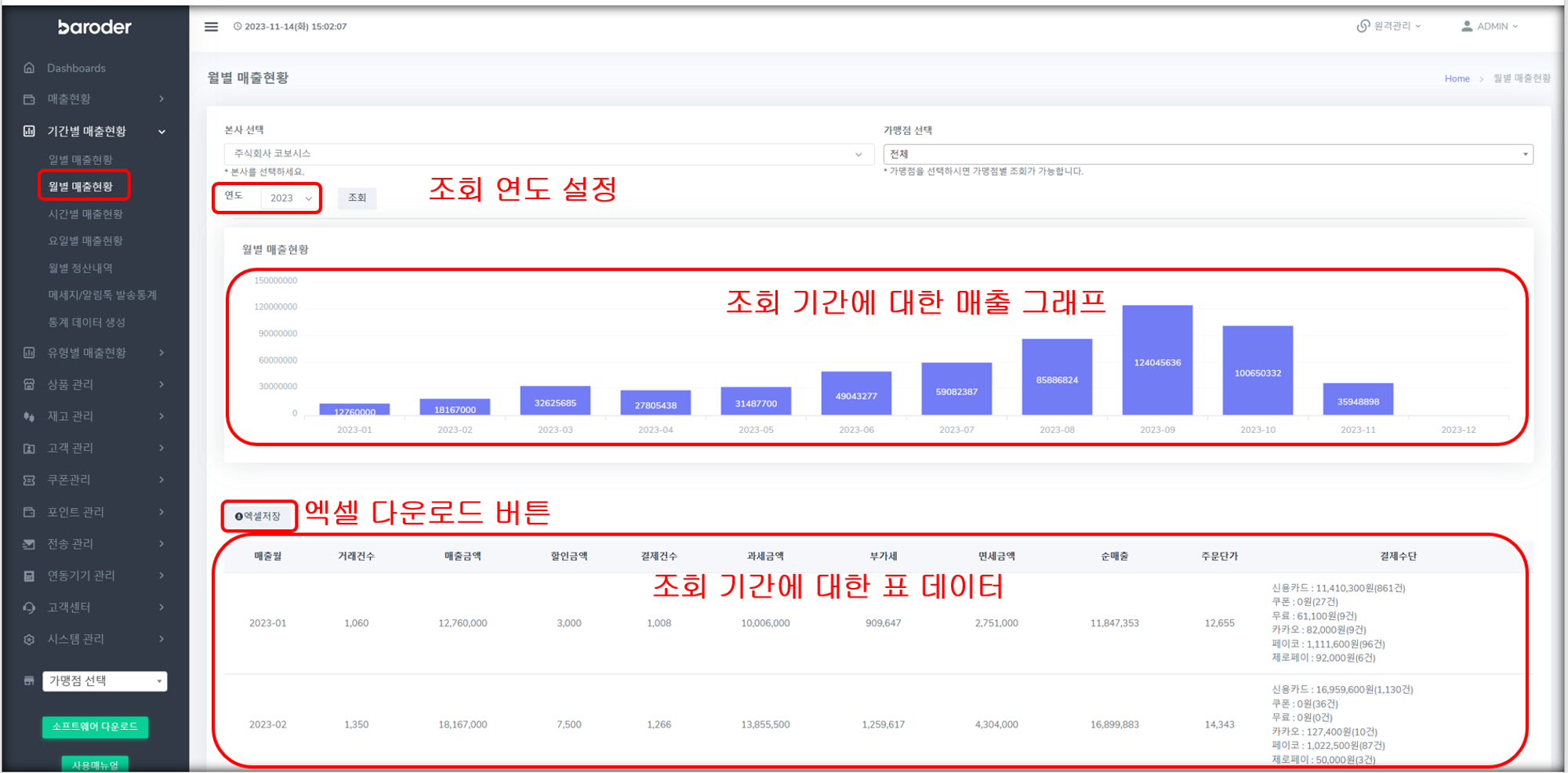 조회 기간을 설정하여 해당 기간에 대한 월별 매출 조회 메뉴
