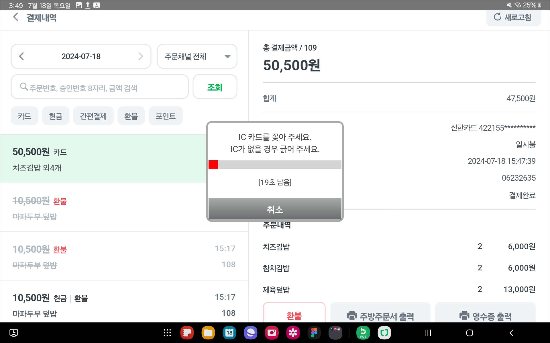 5) 카드가 정상 환불 승인요청시, 환불 완료 팝업이 출력돼요.