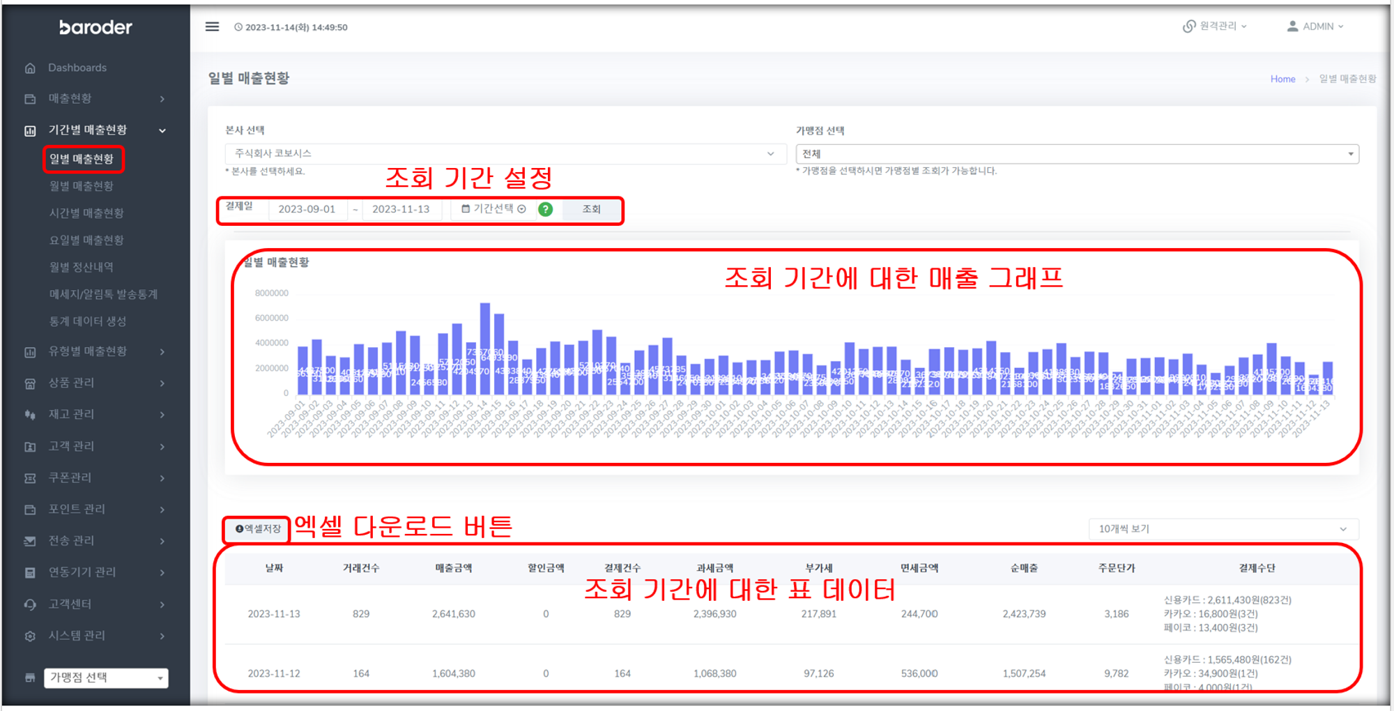 조회 기간을 설정하여 해당 기간에 대한 일자별 매출 조회 메뉴