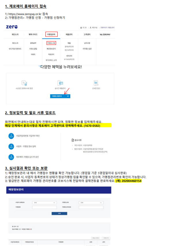 1. 가맹점 신청 및 적용 절차① 제로페이 가맹점 신청 (제로페이 자체 가맹 절차로 별도 진행)② 제로페이 가맹점 관리번호 코보시스 측으로 전달③ 가맹점번호 전달 후 파트너센터 [가맹점관리] > [가맹점 정보관리] 탭의 '간편결제 - 제로페이' 체크박스 선택 후 저장