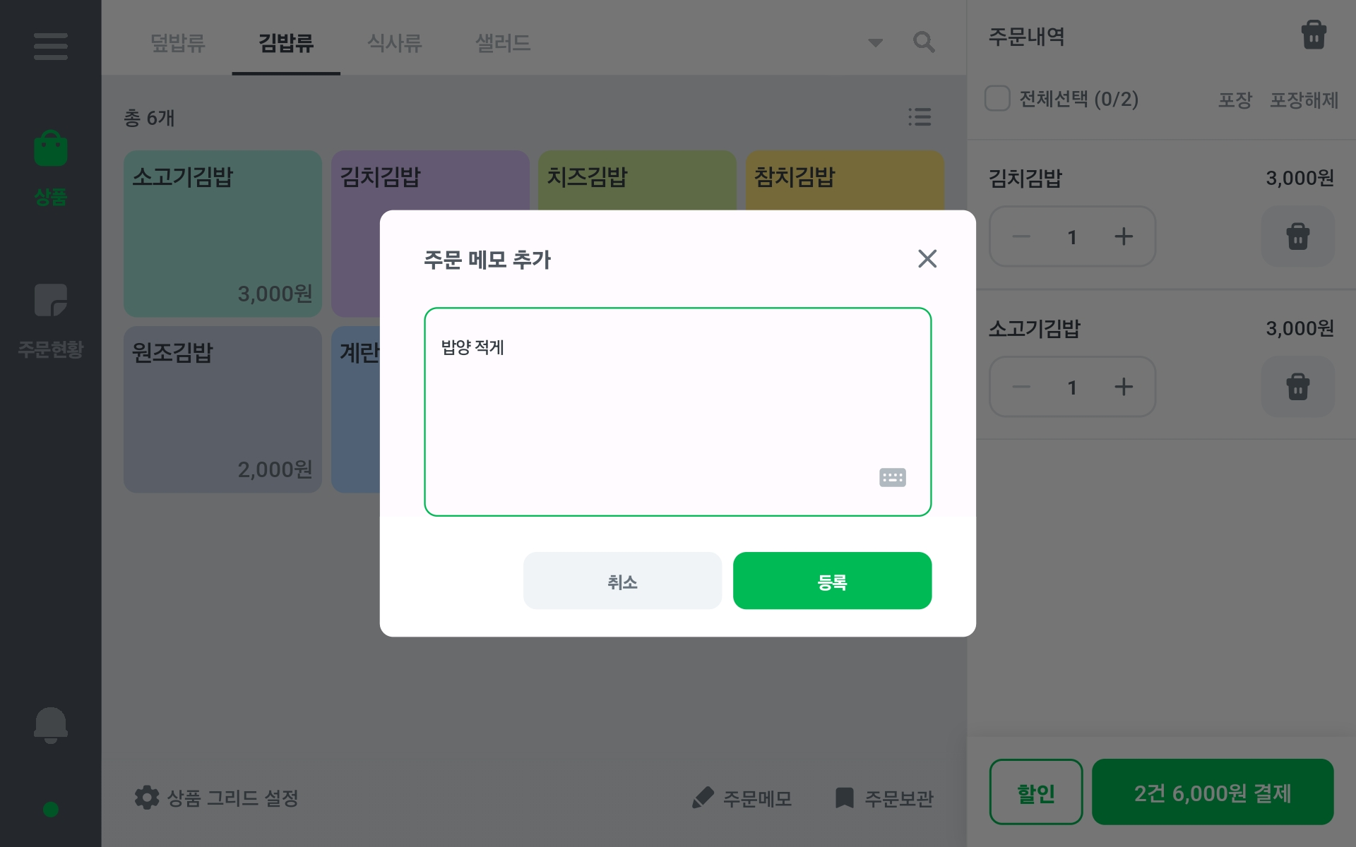 주문메모 기능을 통해 주방과의 정확한 주문전달을 가능하게 하고,