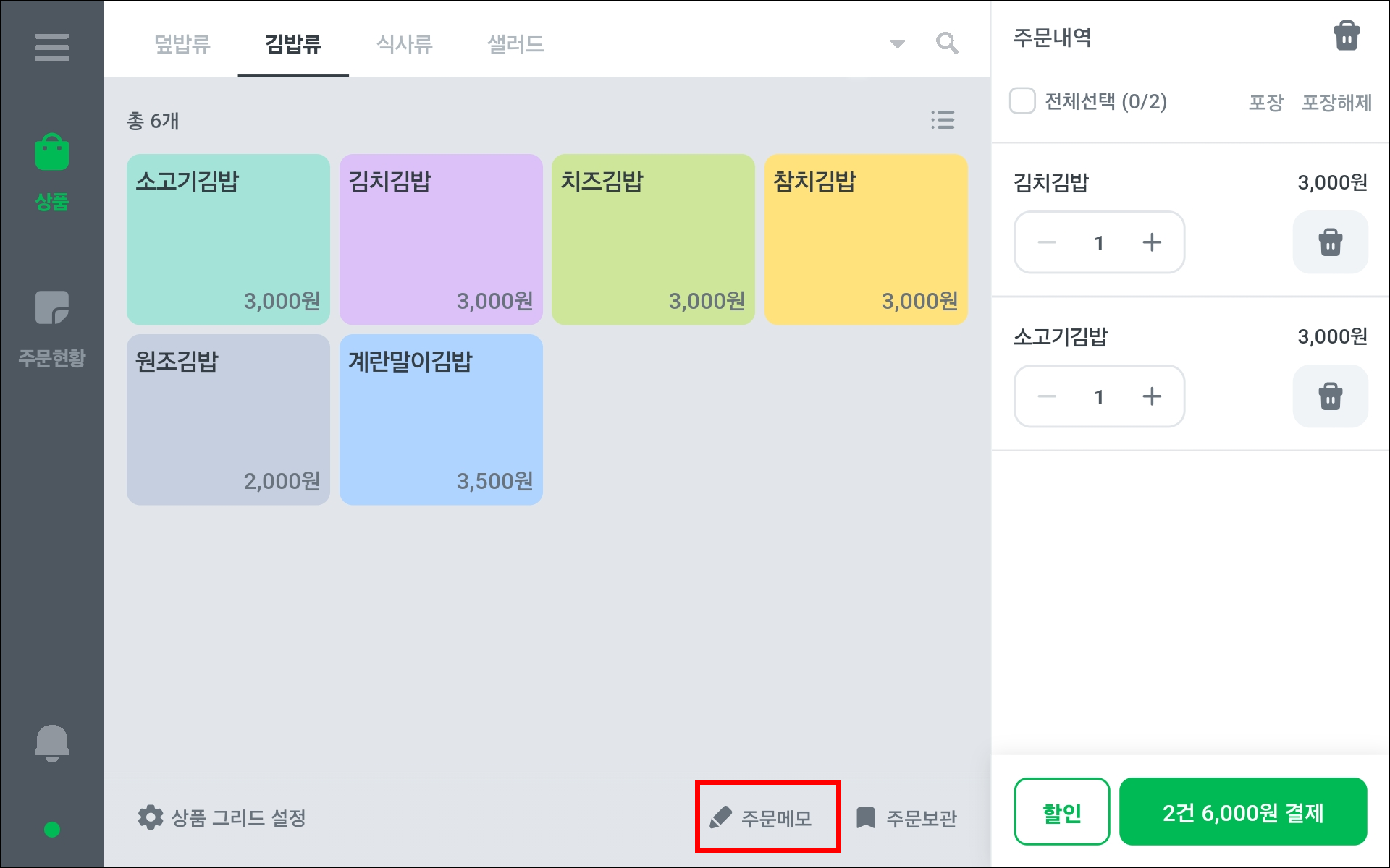 2) 고객의 요청사항을 입력해주세요. 메모 입력시, 주문현황과 주방주문서에 출력할 수 있어요.