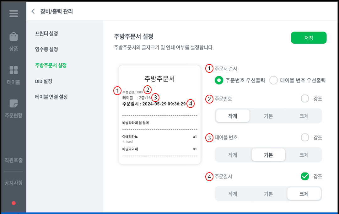 4. 주문일시 글자 크기 (크게 선택,강조 체크시)
