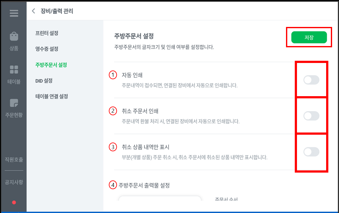 주방주문서 출력물 설정