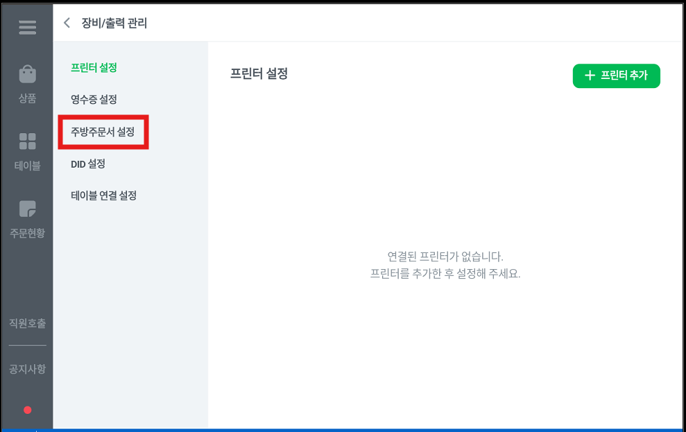 주방주문서 설정 클릭