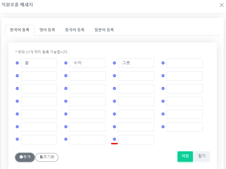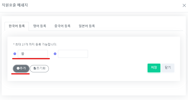 추가 버튼 클릭시 추가로 더 입력 가능한 버튼은 우측 으로 최대 3개 까지 증가하며 총 4개까지 생성 됩니다. 그 이 후로 첫 줄 아래 로 한줄 생성 되며 같은 방식으로 총 최대 27개 까지 등록 가능합니다.