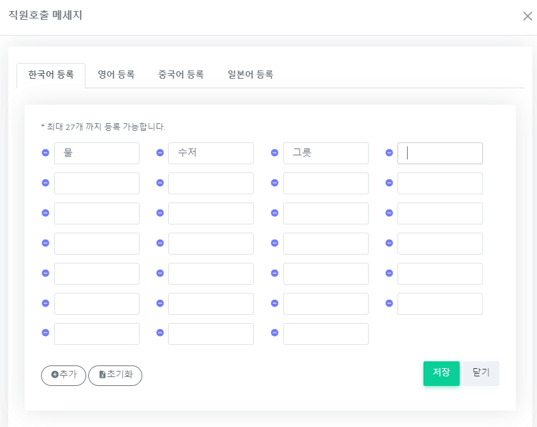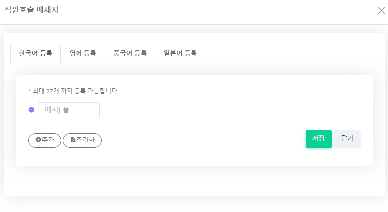 호출 메세지 상에 언어 선택은 테이블 오더에서 선택한 언어에 따라 입력된 메세지가 보여집니다.