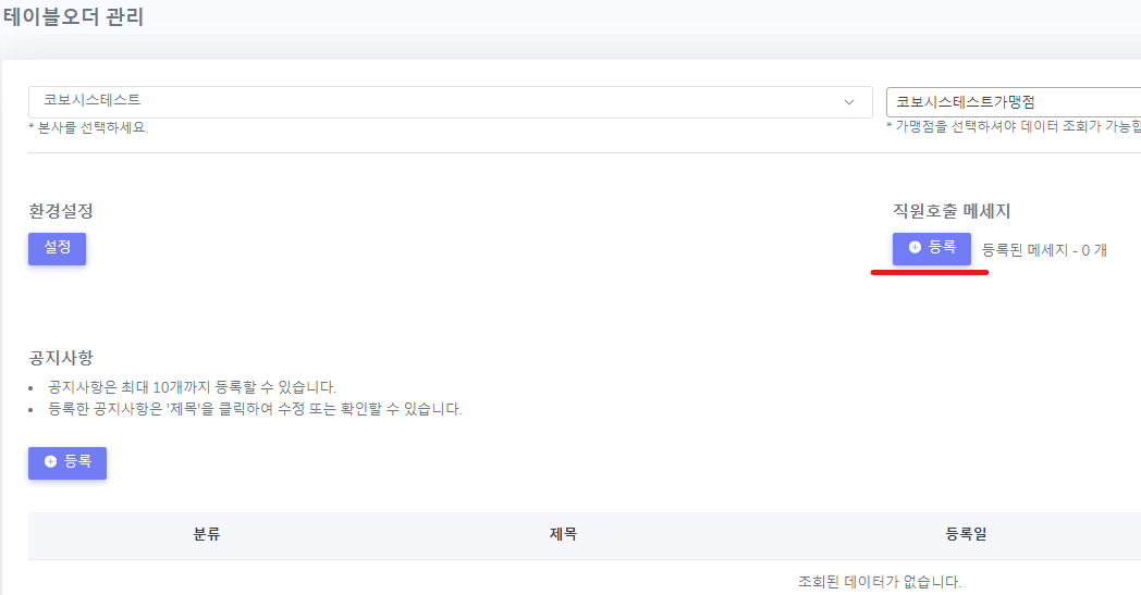 3.가맹점 선택 하였다면, 직원요청 메세지 카테고리 하단 등록 버튼을 클릭 합니다.