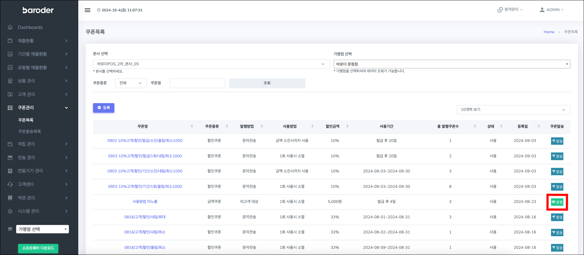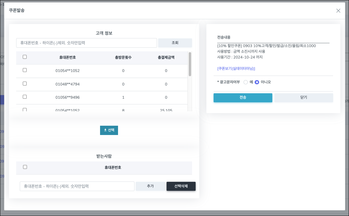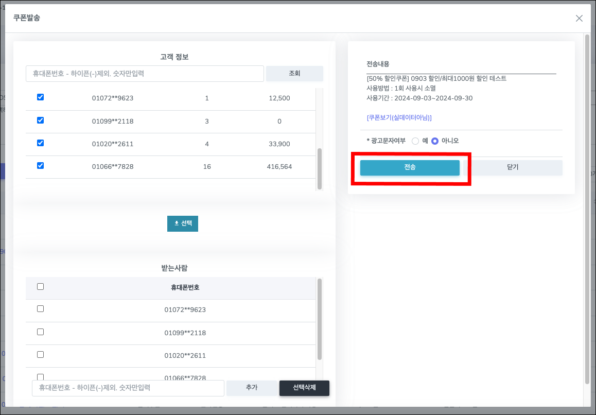쿠폰을 발송할 고객 지정 후, [전송] 버튼 클릭