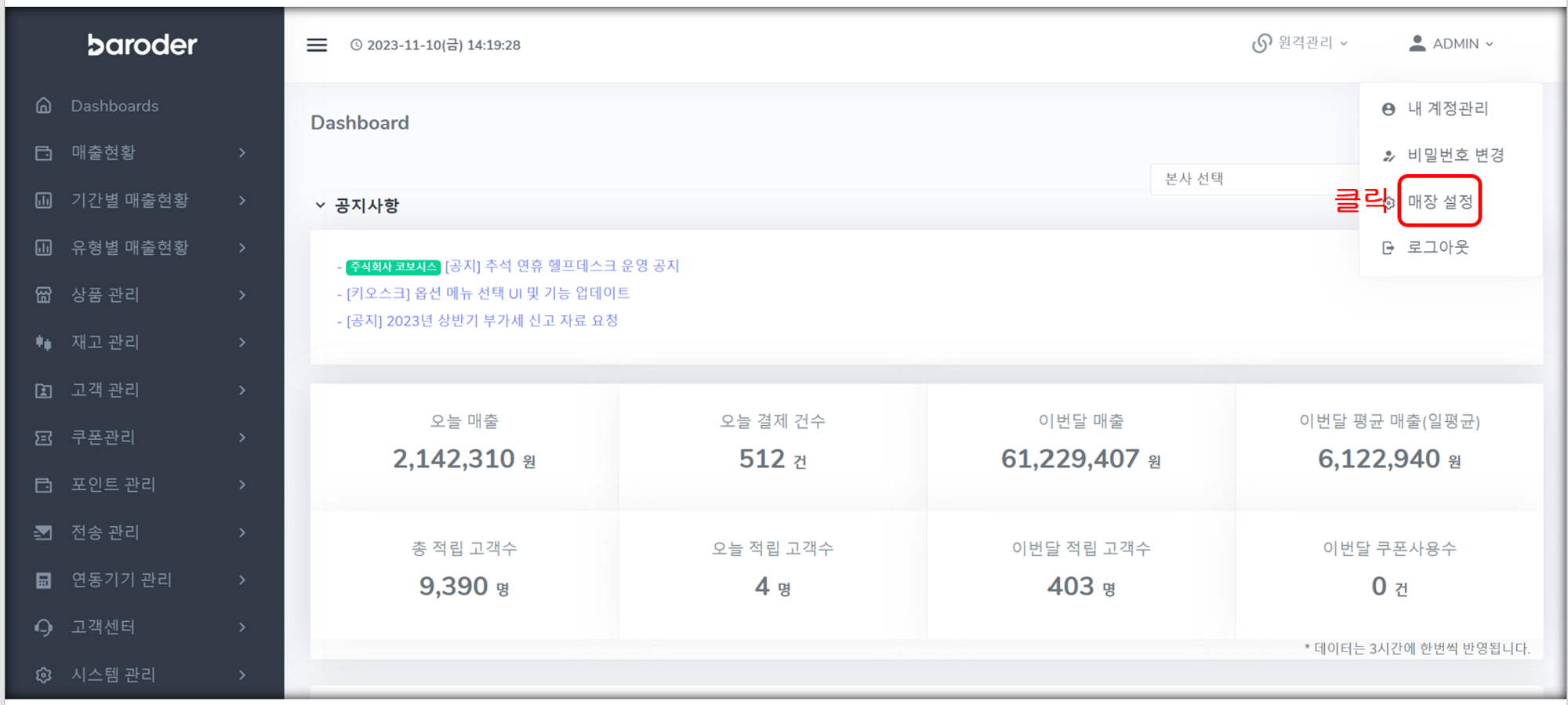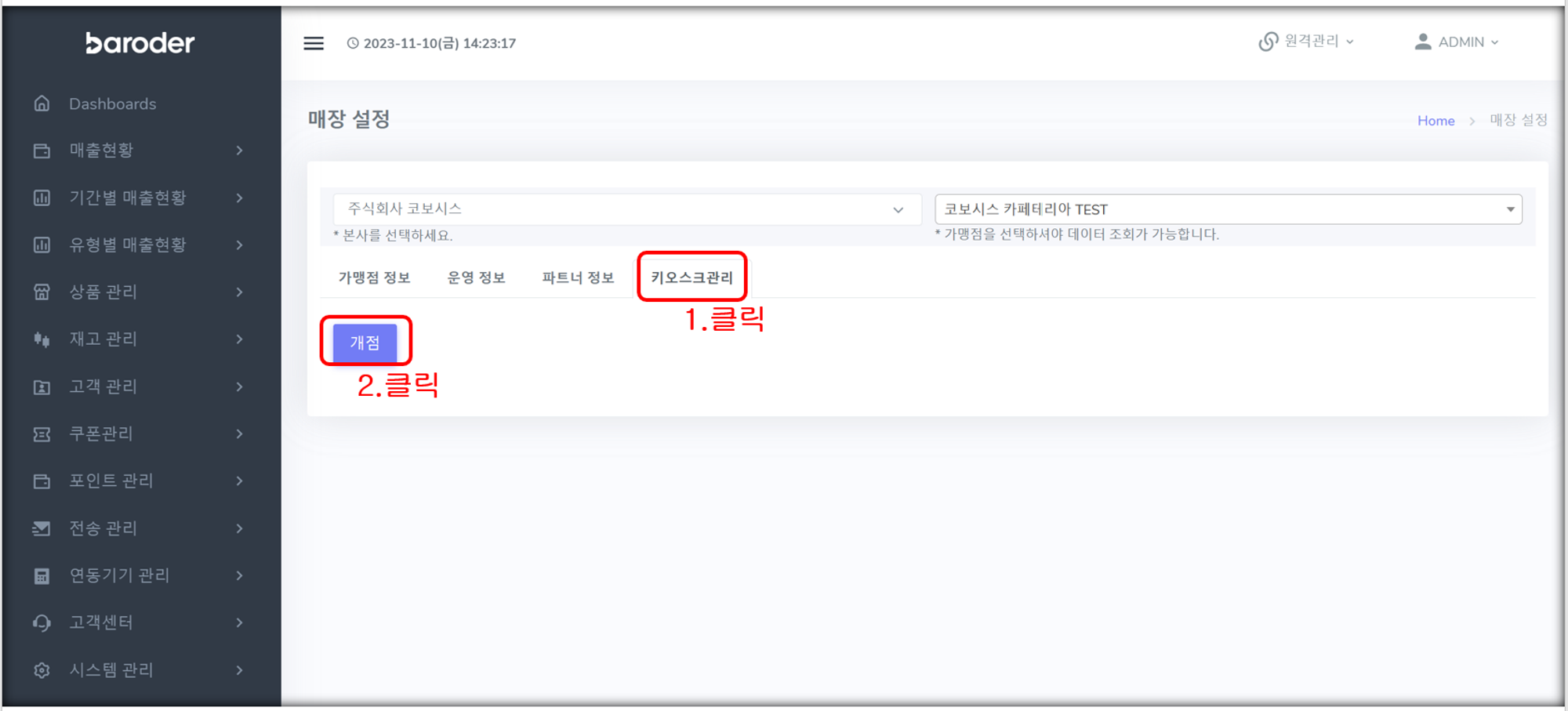 첫화면 우측 상단 계정명 > 매장 설정 > 키오스크 관리 > 개점 버튼 클릭