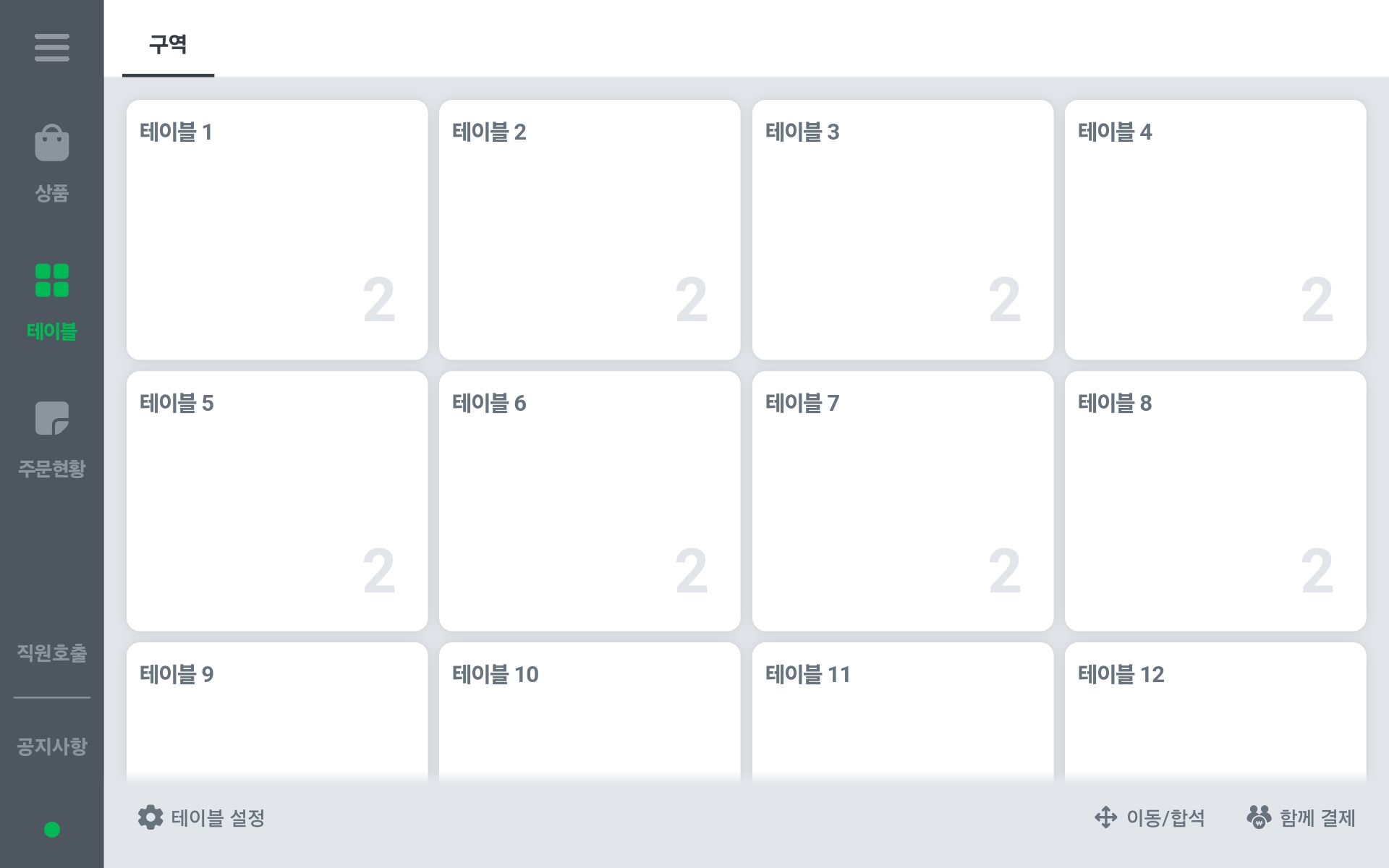 1. 포스 최초 실행시 기본 5개의 테이블을 제공합니다.