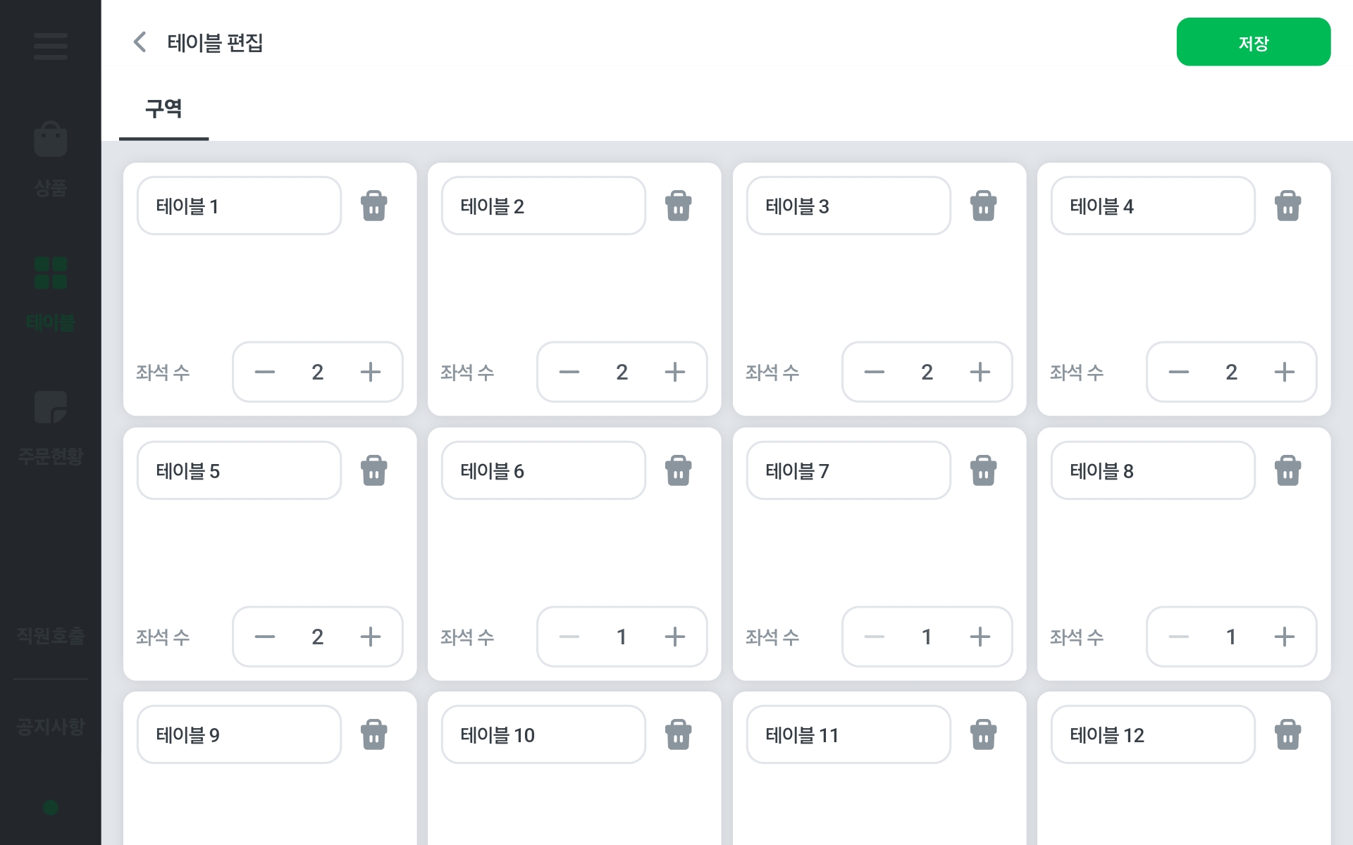 2. 테이블 설정 버튼 클릭 > 테이블 편집 화면으로 진입해, 테이블을 추가할 수 있어요.