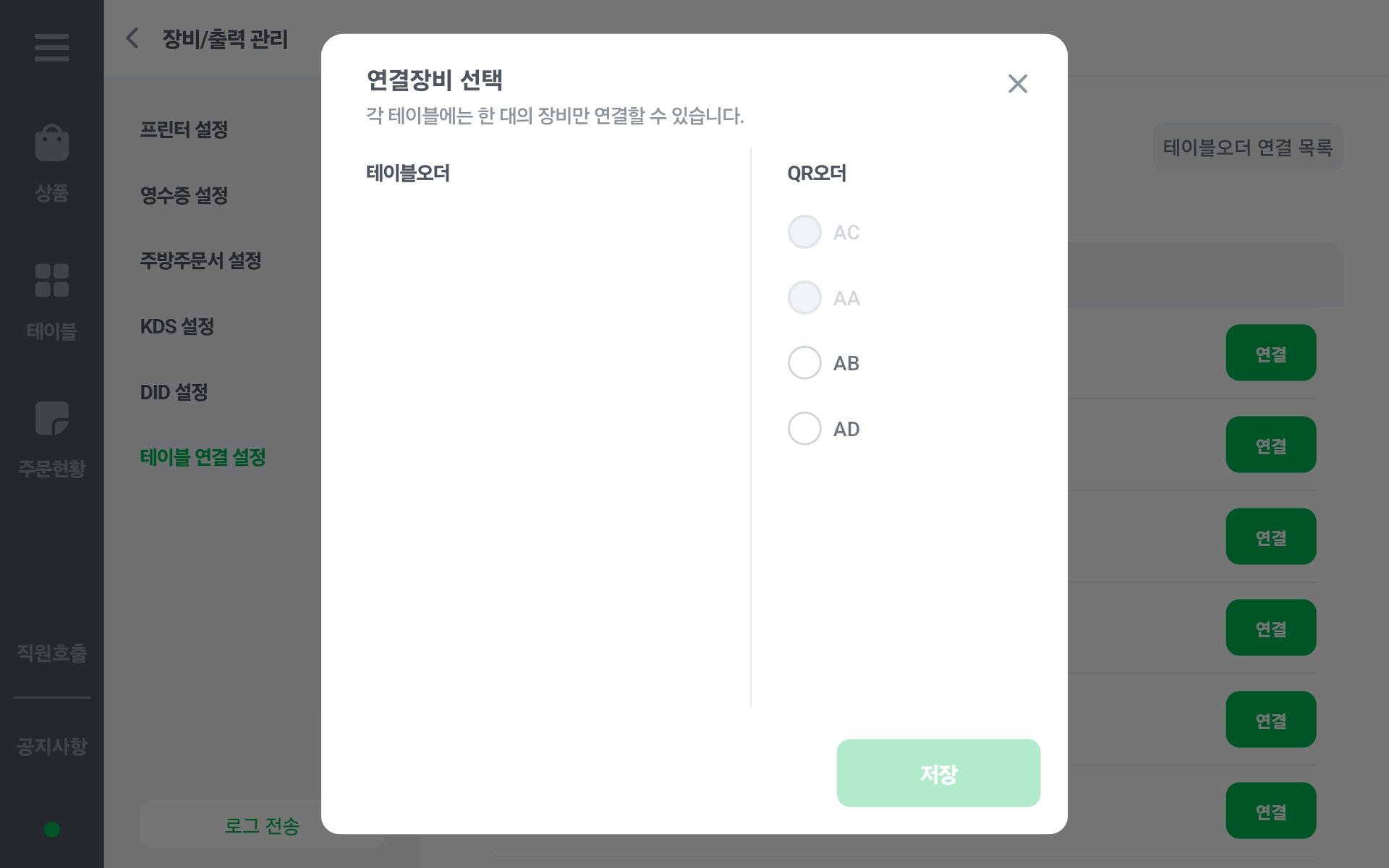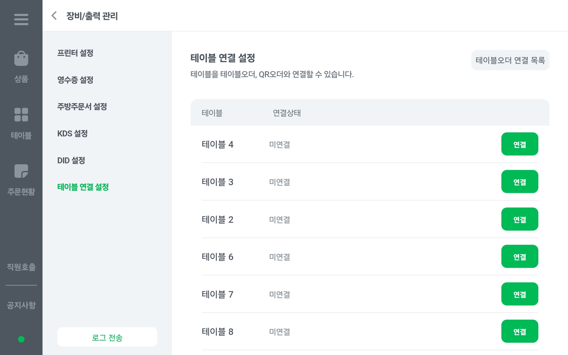 2. 테이블 생성 후, 전체메뉴 > 장비/출력관리 메뉴 > 테이블 연결 설정 화면으로 진입해 주세요.
