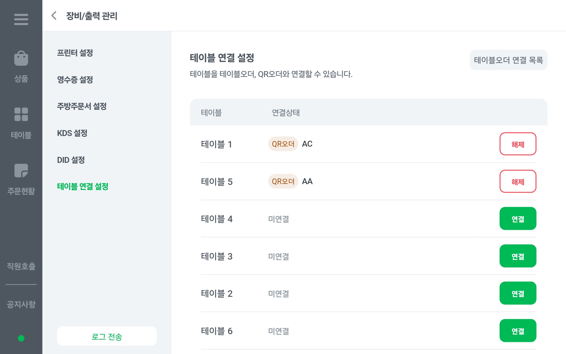 3. QR오더 주문을 연결할 테이블을 확인 후, [연결]버튼을 클릭해주세요.