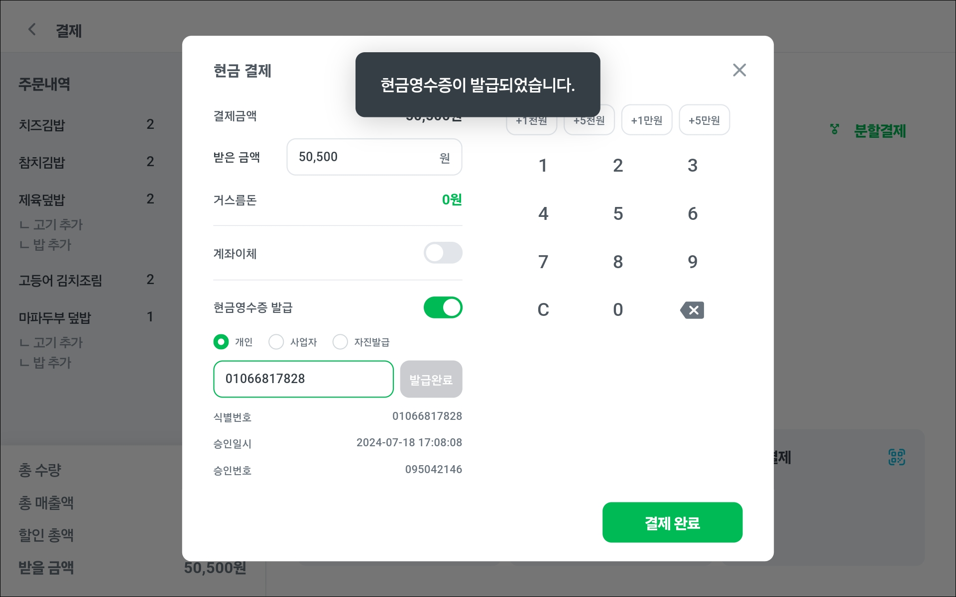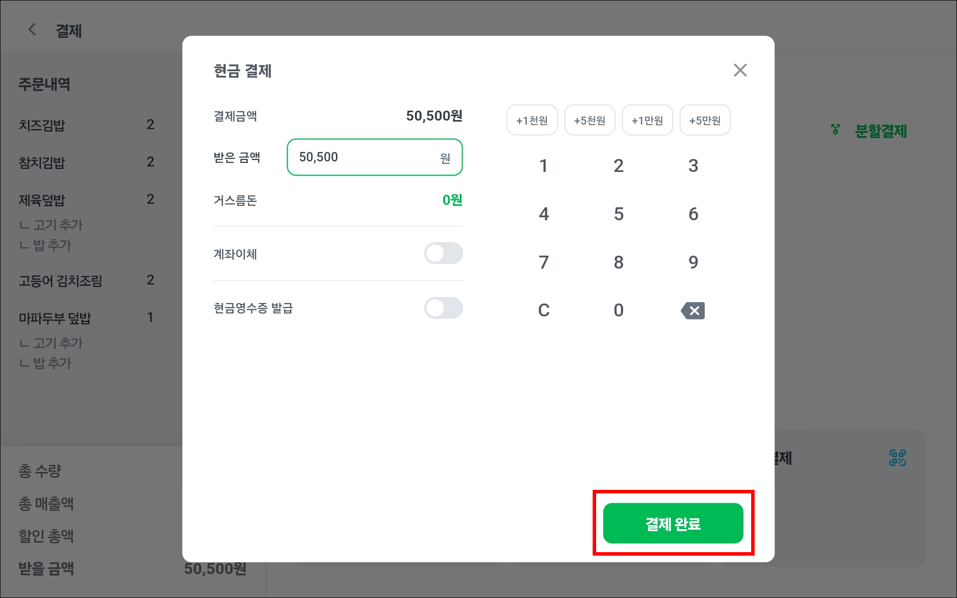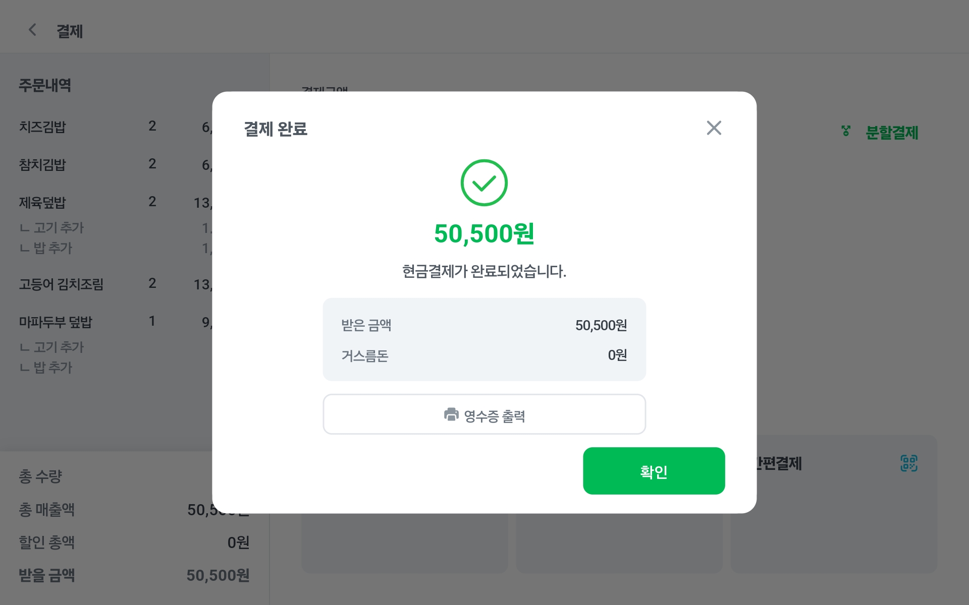 4) 결제완료 팝업에서 결제 금액을 확인 후, 현금결제를 마쳐보세요.