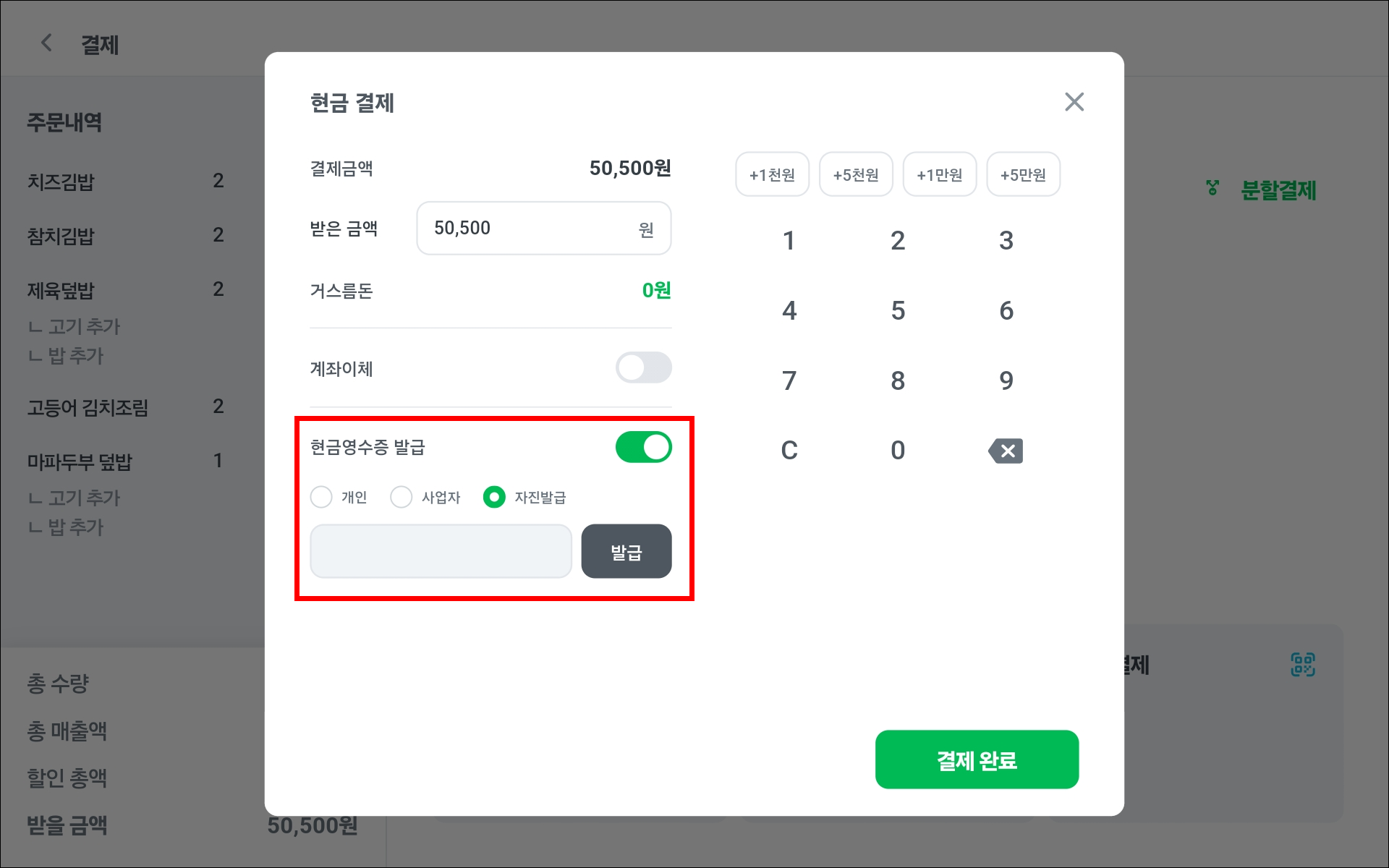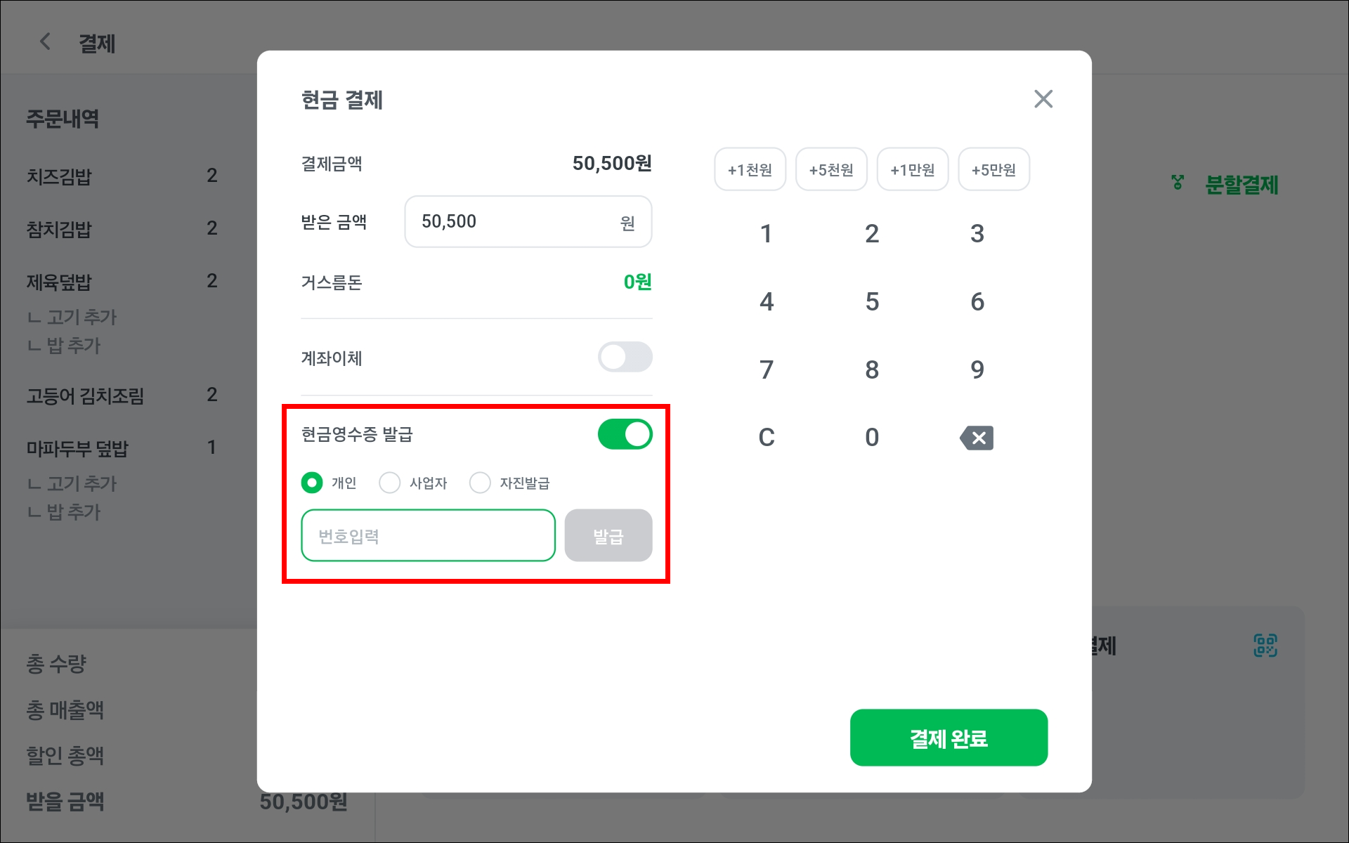 1) 현금 결제 버튼을 선택해, 현금 결제 팝업을 출력해 주세요.