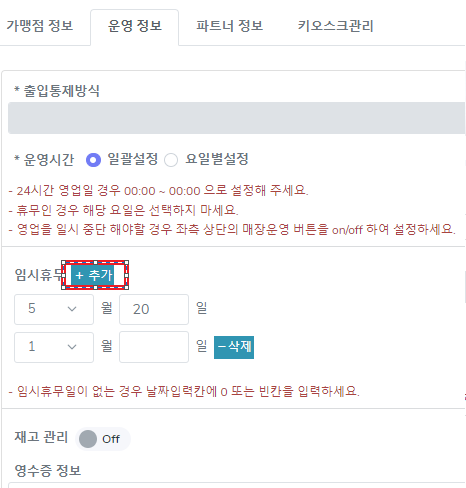 6. 추가 버튼 클릭 시 추가로 휴무를 더 등록 할 수 있습니다.
