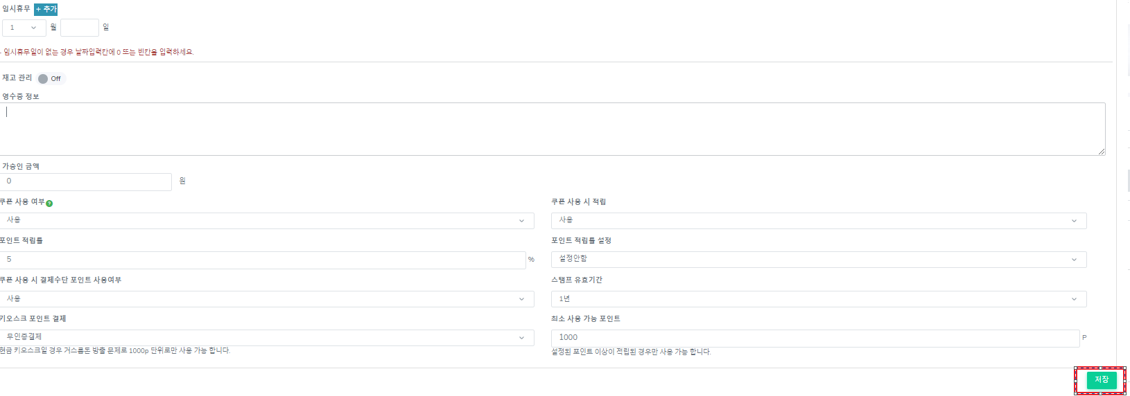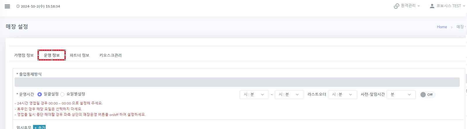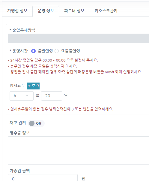 임시 휴무일이 없는 경우 날짜 입력 하는 칸에 0입력 시 월이 입력 되어 있어도 등록 한 휴무일은 적용 되지 않습니다.