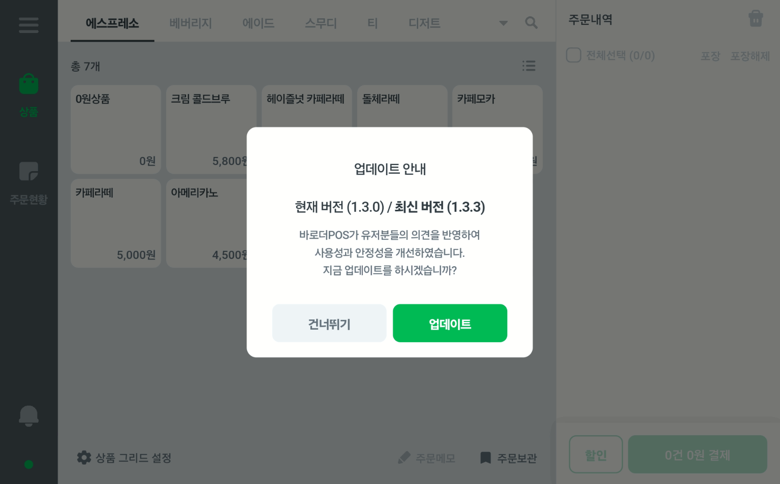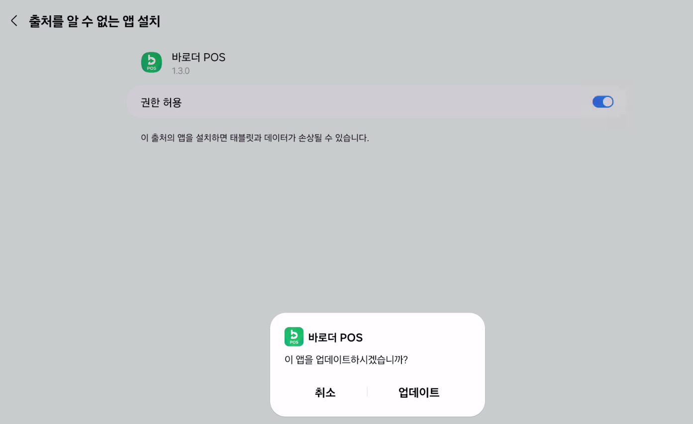 체크 후 업데이트 팝업 되면 "업데이트" 버튼 클릭