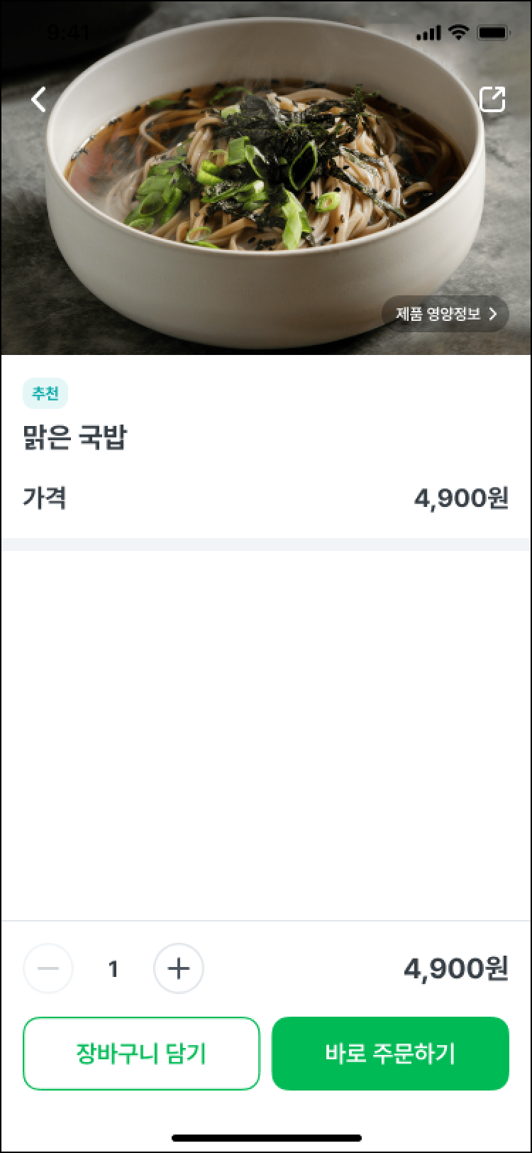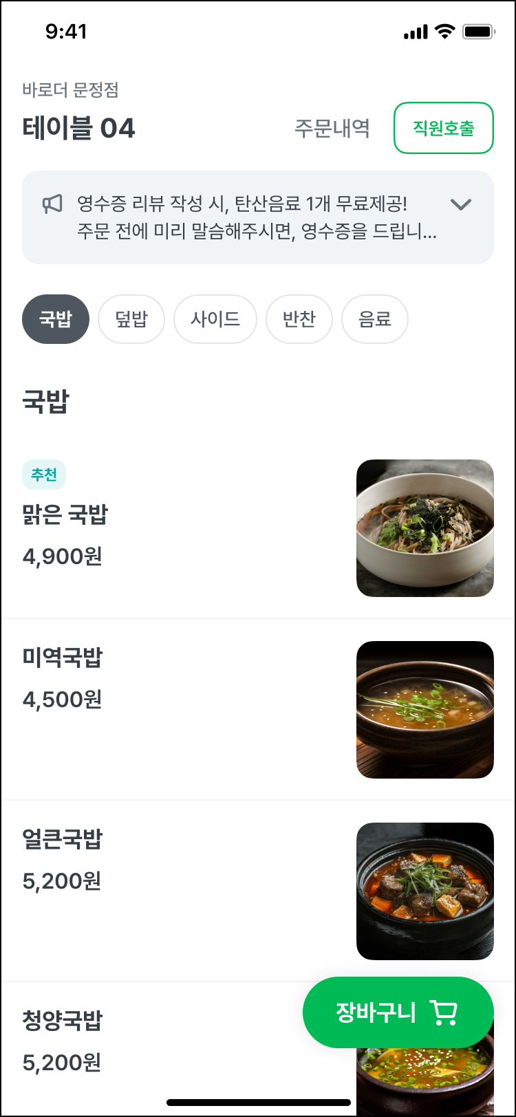 2. QR오더 진입 후, 주문하실 상품을 선택 후 [장바구니 담기] 또는 [바로주문하기] 버튼을 클릭해 주문을 접수할 수 있어요.