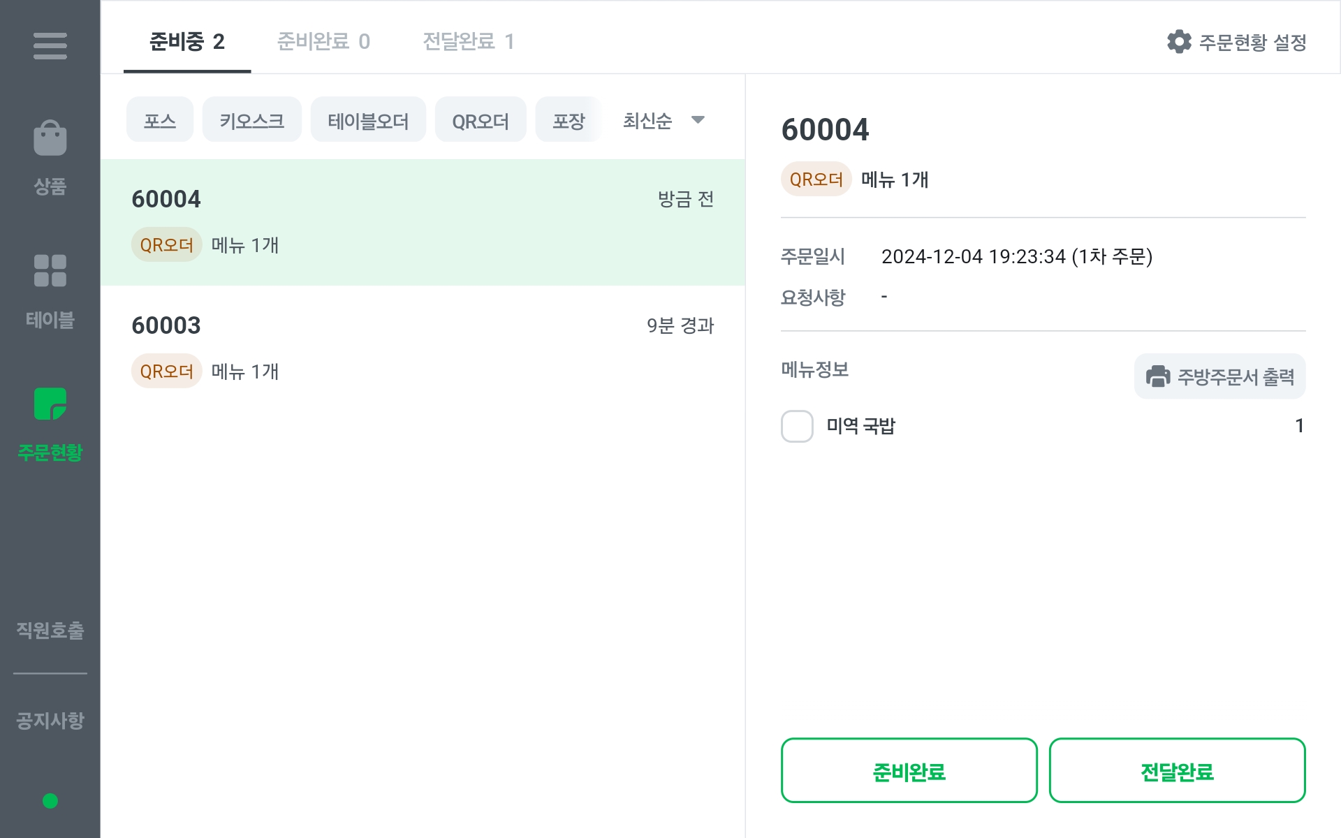 3. QR오더에서 주문 접수시, 포스로 주문내역이 전송돼요.